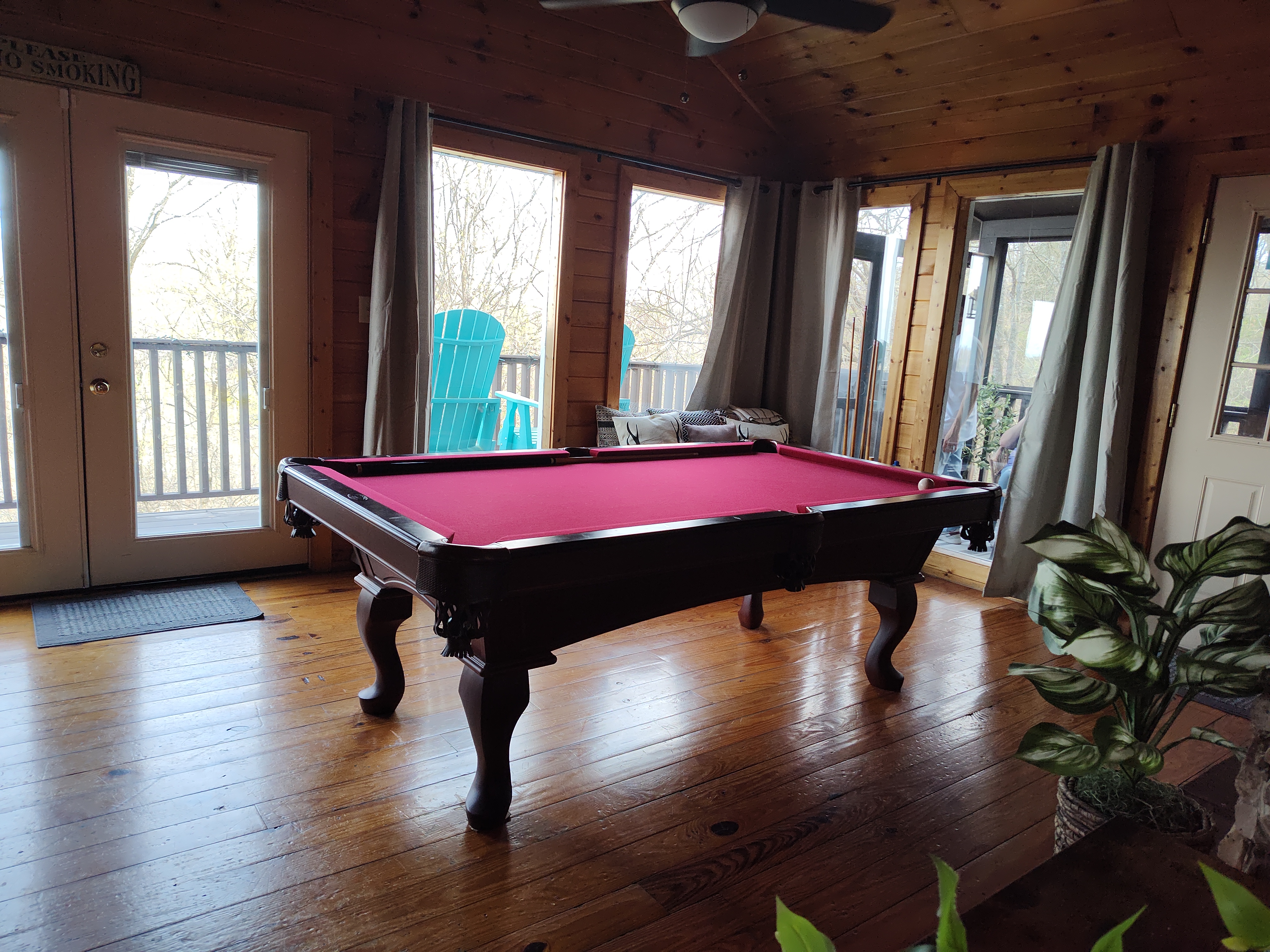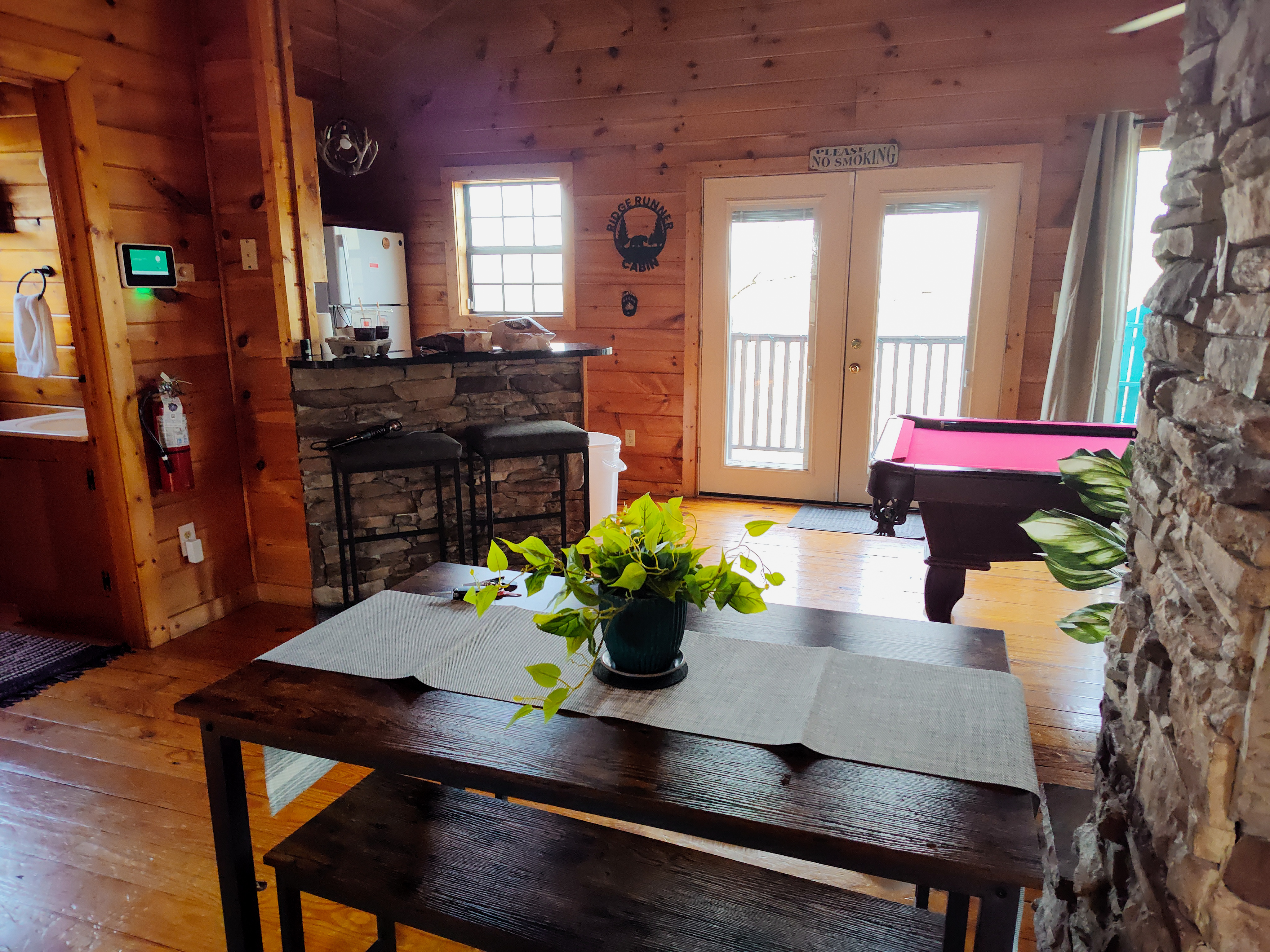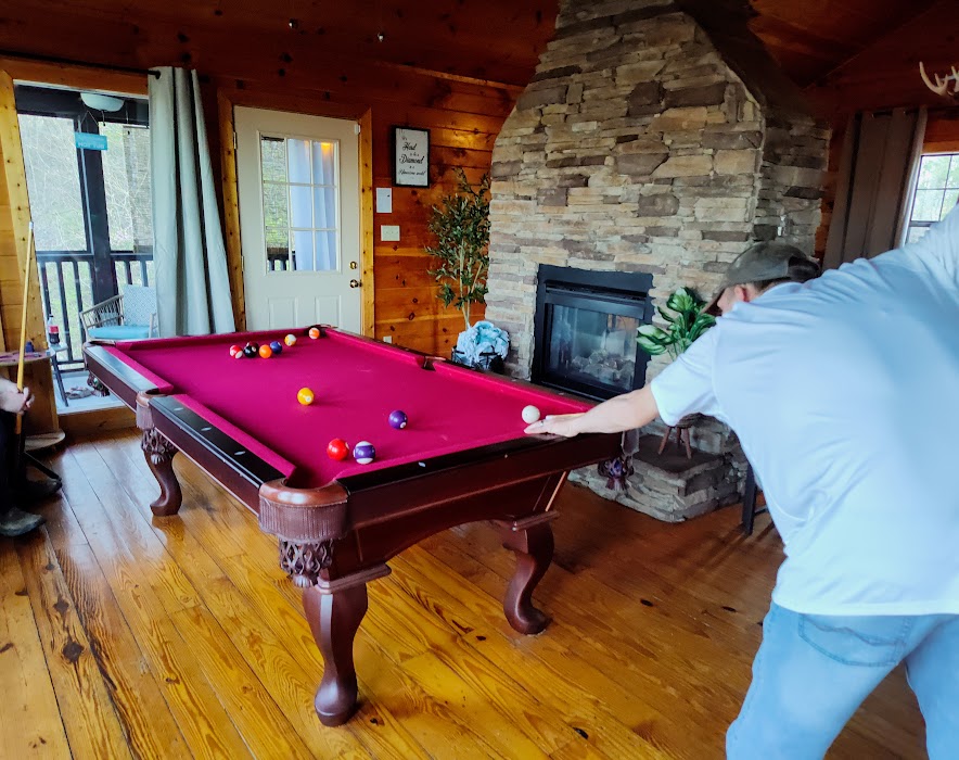 Imagine you have finally arrived at your destination, ready to relax and wind down after a long drive that featured the interstate and several semis that were getting a little too comfortable with your vehicle on the way there… You step inside and drop your bags but wait – you find yourself in awe, checking every amenity the host and cabin have to offer… You see the infinity table, wondering how many games are waiting to be played. You turn to see a fully functional kitchen with all the seasonings your heart could ever desire… you turn again, revealing a covered pool table, waiting for the pool balls to be pocketed where they belong. There’s a beautiful fireplace, a sitting area, and a staircase leading to the sleeping chambers… But before you go down, you look outside on the balcony. You open the glass doors, and there sits a gorgeous view you have seen in a while of nature. There’s a gas grill to the right, begging for some steaks to be grilled upon it. You approach and find the screened-in part of the balcony that wraps around the cabin, which keeps the bugs away, providing a fine hot-tubbing experience. Finally, you have seen all that you thought occupied this floor. But as you go towards the staircase, you find a record player with vinyl records calling your name… Dolly Parton, Hank Williams Jr, and even the latest Taylor Swift Midnights album. After exploring the table of wonders, you continue your mission downstairs. There’s an arcade with many classic games, such as Pacman, Dig Dug, and Galactica. There are two bedrooms, the master, which connects directly to the big bathroom with a fancy jacuzzi, and another bedroom that has a Nintendo 64 just resting under the television. This is every gamer’s dream so far! – At least, it was definitely my dream come true! This cabin has it all, so I give it five stars. There is enough entertainment to enjoy a weekend away without leaving the premises. Ridge Runner Cabin is a great place to celebrate anniversaries and birthdays or just take some time away from everyday life and breathe.