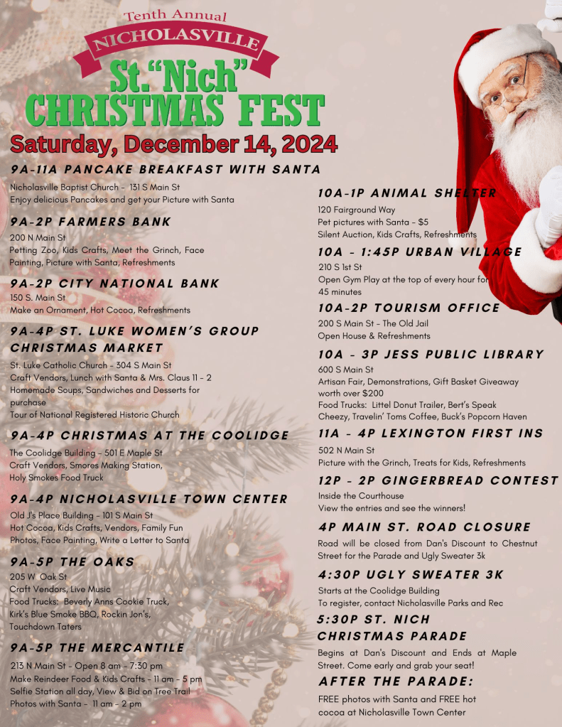- December 14th 9 am to 6 pm – St Nich Christmas Fest – Downtown Nicholasville (LIST OF FEATURED EVENTS BELOW IN AN IMAGE)