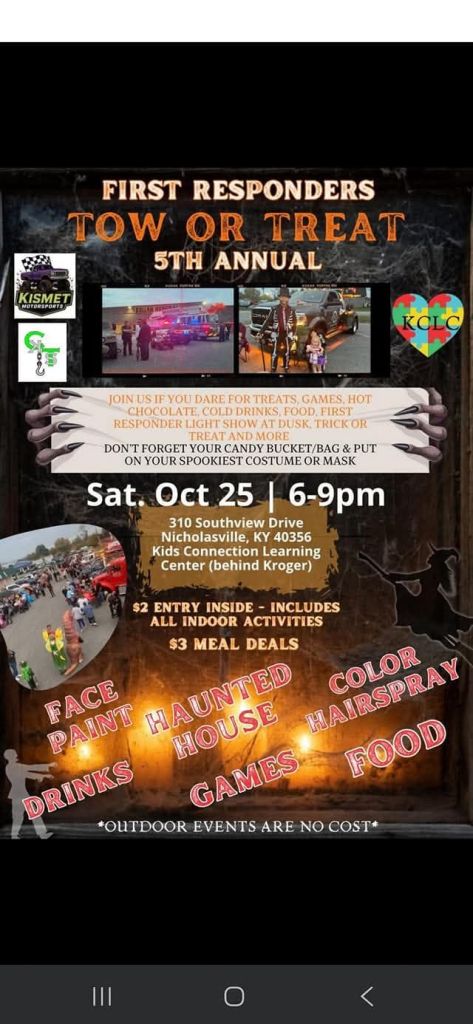 - 6-9 pm – 310 Southview Dr, Nicholasville – First Responders 5th Annual Tow or Treat ($2 entry inside)