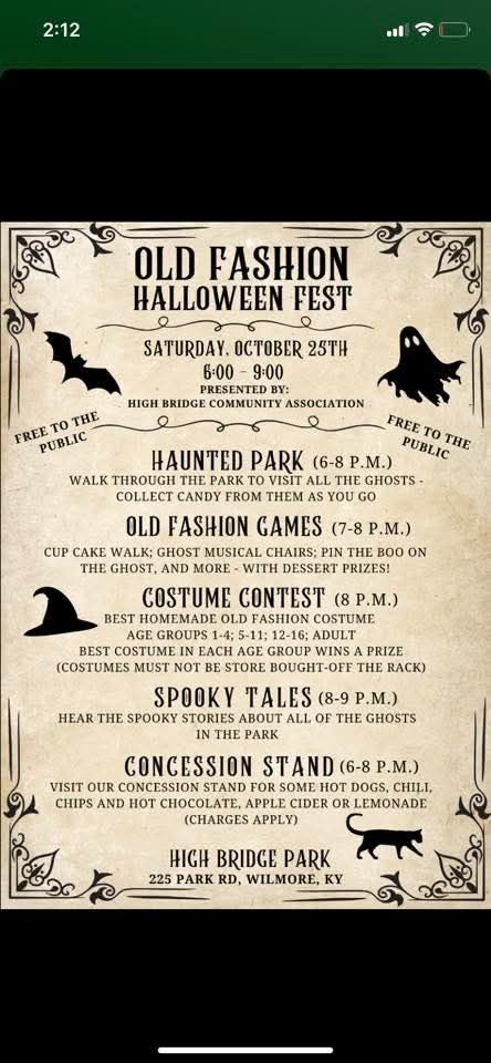 - 6-9 pm – High Bridge Park, Wilmore – Old Fashion Halloween Fest FREE