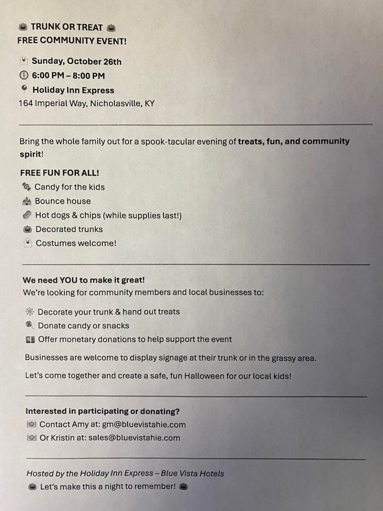 - 6-8 pm – Holiday Inn Express (Imperial Way), Nicholasville – Trunk or Treat FREE
