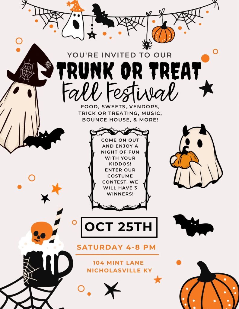 - 4-8 pm – 104 Mint Lane, Nicholasville – Trunk or Treat/Fall Festival FREE