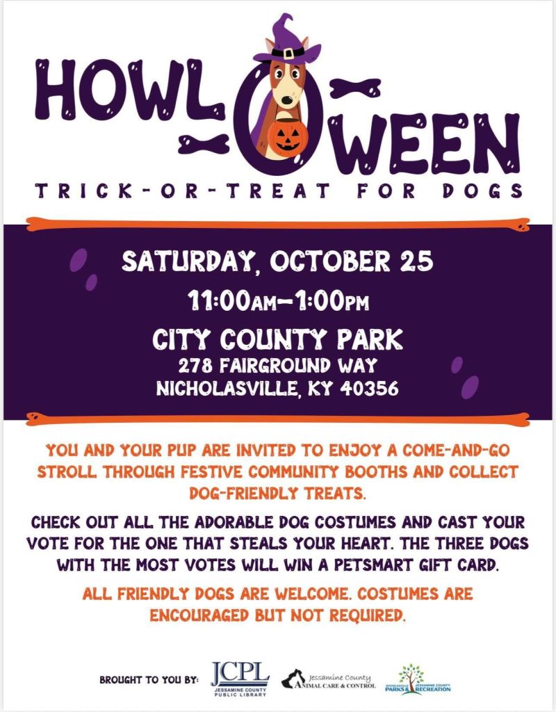 - 11-1 pm – City Co. Park, Nicholasville – Howloween Trick or Treat for Dogs
