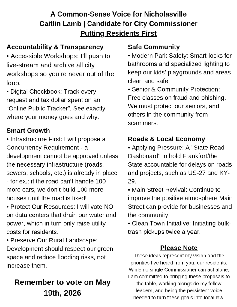 I want to protect all residents by pushing for upgraded park safety and even classes to help prevent those vulnerable to scam and phishing attempts. Our parks should be a sanctuary for our kids and families, which is why I’m pushing for better lighting, regular maintenance, and increased safety measures – including smart-locks for bathrooms! Protection also means looking out for our most vulnerable neighbors. With so many scams targeting our seniors and families today, I want to find more ways on how the city can host simple, accessible classes that teach us how to spot a phishing attempt or a phone scam before it’s too late – even if we could allow groups focused on this, to use city space to inform citizens of these dangers, that would be a great thing to look into. I’m asking for your trust, and am working to earn it through transparency and a commitment to keeping every corner of Nicholasville safe and informed.